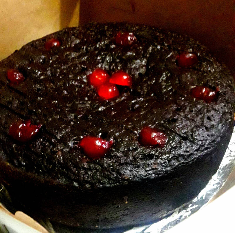 Black cake is not that crumby and it has a dense texture like that of a fruit cake. The rich deep black color may resemble chocolate cakes, but actually it comes from the rum and wine soaked dried fruits that were grounded and mixed into the batter and most notably browning .