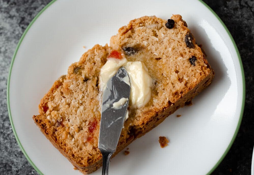Generously studded with grated sweet coconut, mixed fruits, lemon peel, cherries, raisins, and currants.